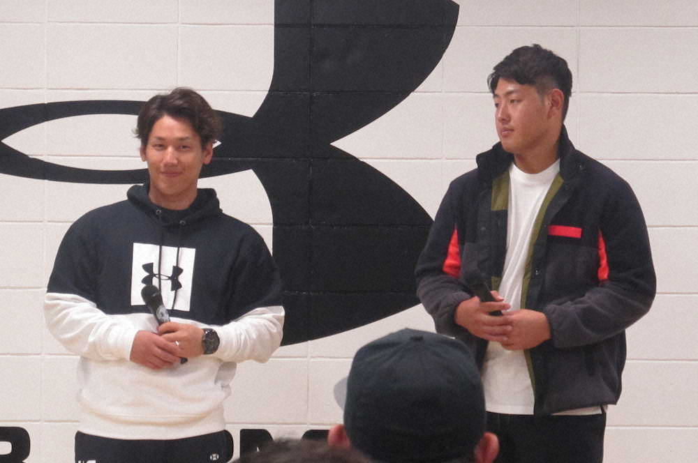 巨人・岡本が18日、都内の「UNDER ARMOUR BRAND HOUSE 新宿」でのトークショーにオリックス・吉田正とともに参加した。