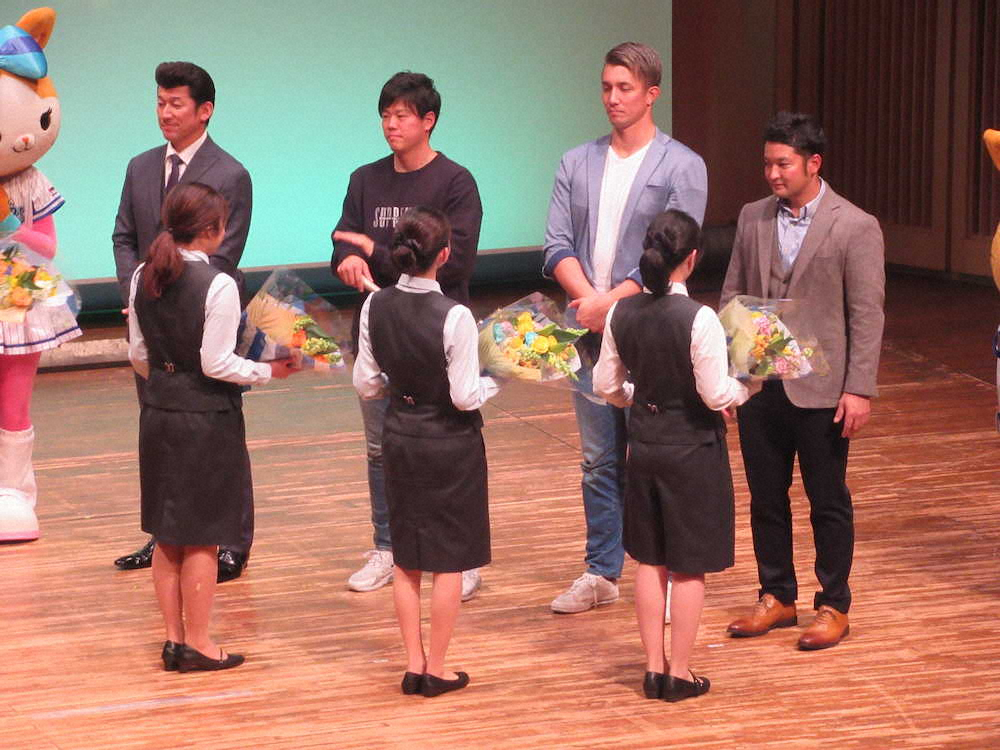 質問コーナーでは「サンタさんにプレゼントをもらうなら」と聞かれ、嶺井が「打率です」と即答。上茶谷は「(東洋大同期の)ソフトバンク甲斐野のフォークがほしい。大学の時からずっとお願いしているのに、まだもらえないです」と笑わせた。