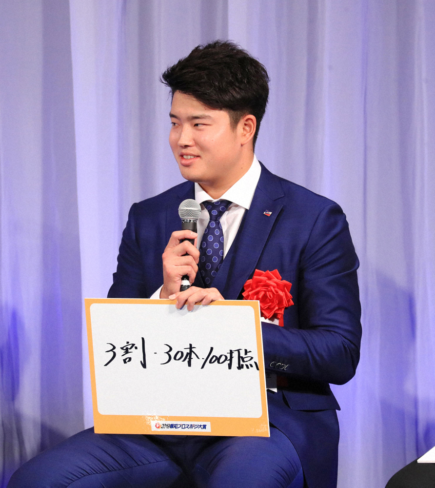 デビュー直後から井上のファンだったことを明かし、世界戦もチェック。ツーショット写真にも納まり「凄いの一言です」と興奮を隠せなかった。来季の目標には「3割30本100打点」を掲げたが「まずはチームが優勝してからです」と最下位に沈んだチームの浮上を最優先と強調した。