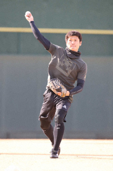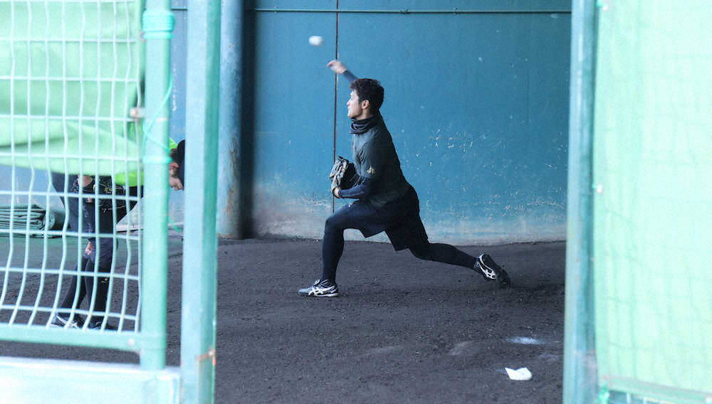 横山、植田らチームメートとあいさつを交わすと2年前から取り入れているという米国の施設「ドライブラインベースボール」で使われている6種類の加重ボールを使ってウオーミングアップ。その後キャッチボールで肩を温めると、ブルペン入りして捕手を立たせて30球を投じた。