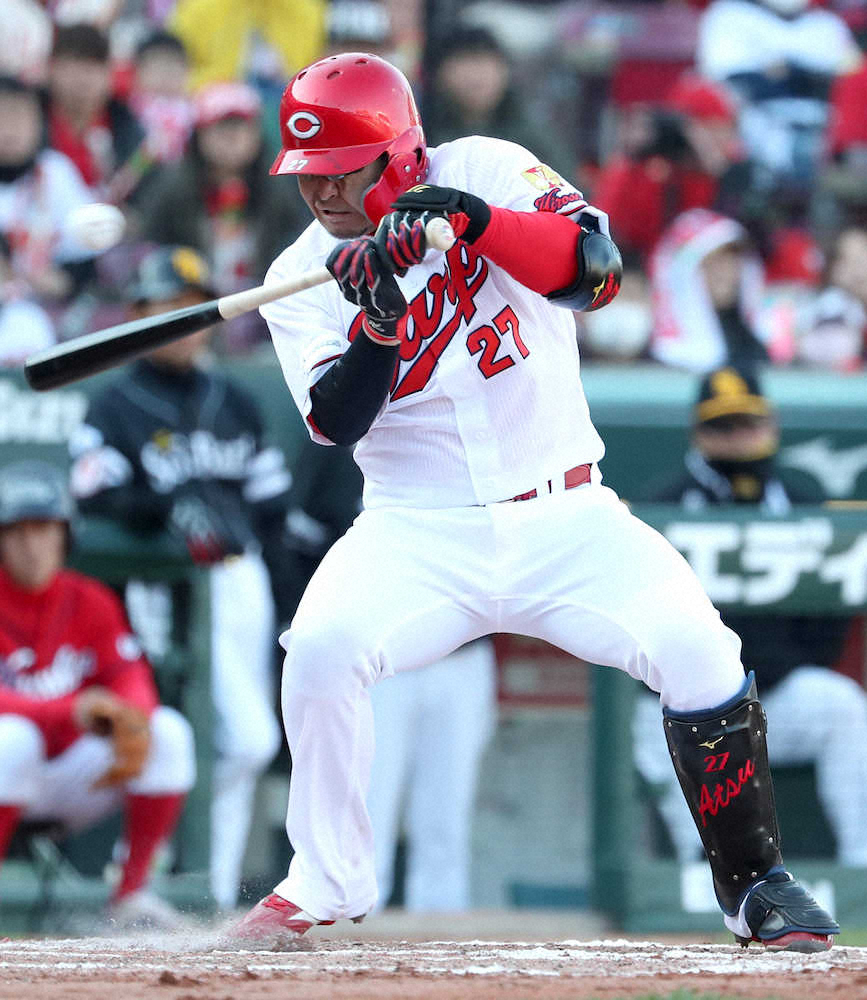 3月24日のオープン戦でソフトバンク・甲斐野から死球を受けた広島・会沢