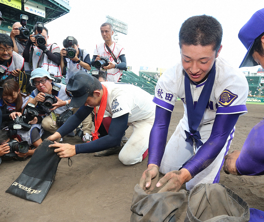 その当事者である日本ハム・吉田輝(金足農)に当時の話を聞く機会があった。甲子園決勝で大阪桐蔭に2―13で敗れた閉会式後。三塁側で勝者の大阪桐蔭ナインが西谷浩一監督を胴上げする中、吉田輝ら金足農ナインが一塁側で甲子園の土を集めていると、竹中氏が吉田輝に近寄ってきたという。「行ってこい、行ってこい」と背中をポンと叩かれて送り出された吉田輝は「行ってきます」と小走りで激闘が終わったばかりのマウンドに駆け寄り、自身を成長させてくれたマウンドの土を感慨深げに集めた。その後は胴上げを終えた大阪桐蔭のエースで、後に日本ハムで同僚となる柿木も竹中氏に促されて合流。甲子園決勝のマウンドに立った者だけが許される特別な時間。「凄くお世話になりました」と感謝する吉田輝にとって甲子園のマウンドの土は今でも宝物だ。