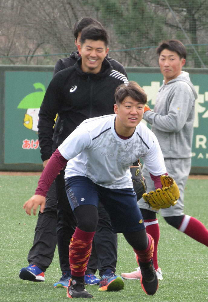 2軍施設でノックを受ける楽天のドラフト5位・福森(中央)