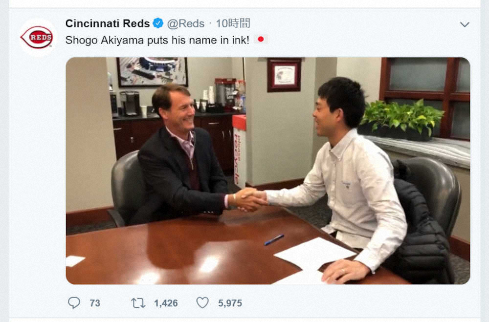 書類にサインし、関係者と握手する秋山(シンシナティレッズ公式ツイッターから)
