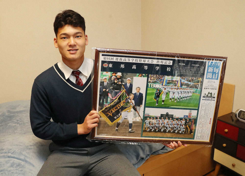 昨春のセンバツで優勝した際の写真パネルを持参し「去年の1番の思い出。仲間のことを思い出すかなと思って。部屋に飾りたいです」と笑みを浮かべた。