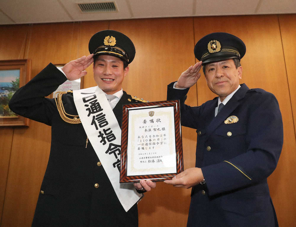 阪神の木浪が10日、『110番の日』にちなみ、兵庫県警の一日通信司令官を務めた。制服に身を包んだ2年目の若虎は、昨季とは真逆となる開幕ダッシュを宣言した。