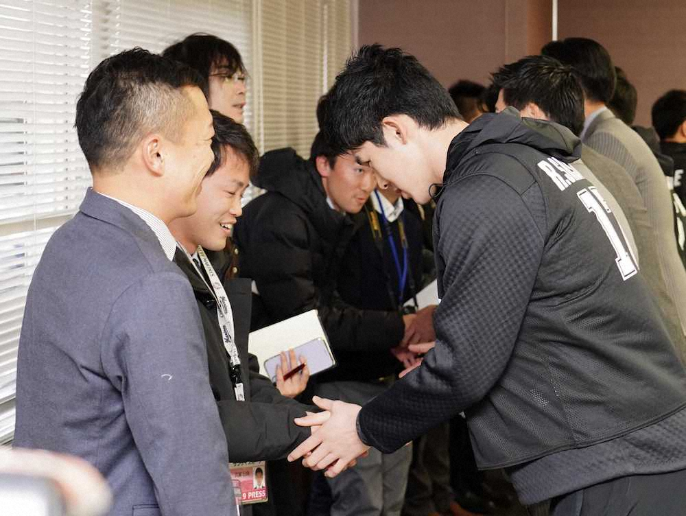 他のルーキーも含め、会場にいた河合克美オーナー代行兼球団社長ら球団スタッフ、報道陣らと「握手競争」を実施。2分間で、どれだけの人と自己紹介をして握手をできるかというもので、佐々木朗も積極的に動き回った。なお、優勝したのはドラフト2位・佐藤都志也捕手(東洋大)の24人だった。
