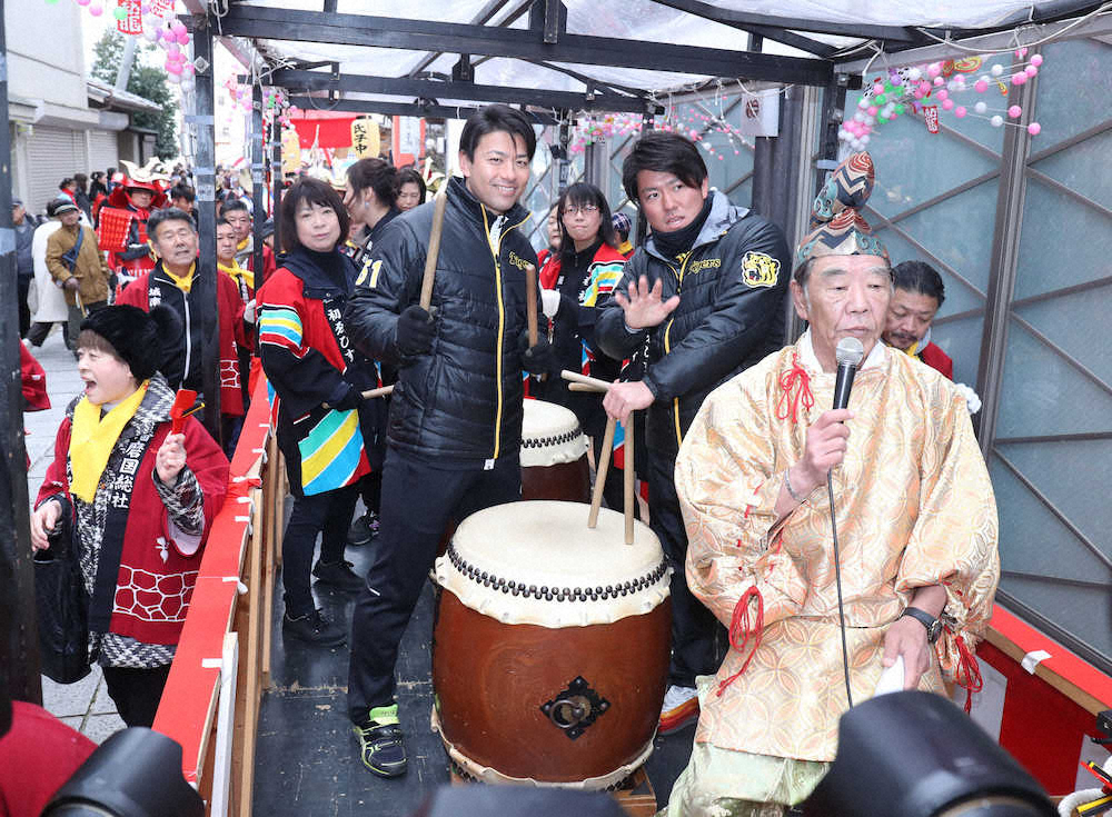 阪神の伊藤隼太外野手(31)と長坂拳弥捕手(25)が13日、姫路市内の播磨国総社で行われた「宝恵駕籠(ほえかご)行列」に初めて参加した。2人はかけ声に合わせて太鼓を叩きながら姫路の町を回り、「楽しいです」と声をそろえた。