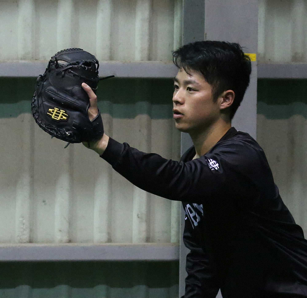 ブルペンでボールを受ける梅林(撮影・西海健太郎)