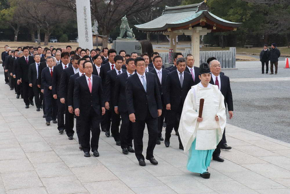 護国神社を参拝し、必勝祈願を行う松田元オーナー、佐々岡監督ら