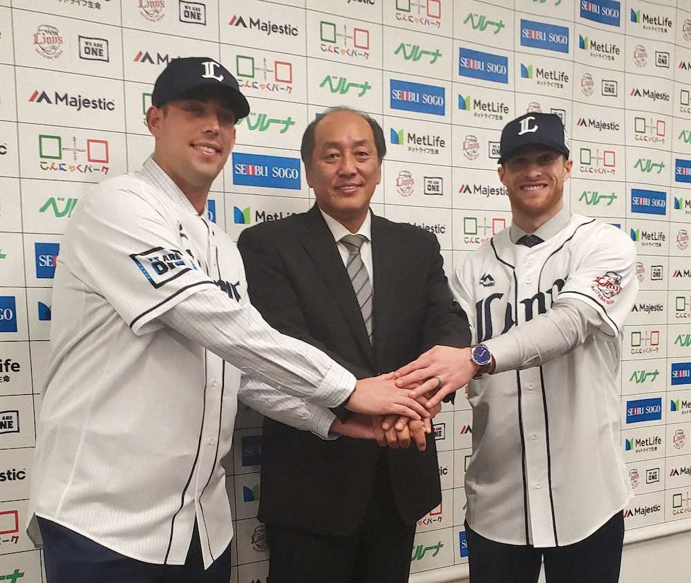入団会見を行った西武の新外国人スパンジェンバーグ(右)とノリン