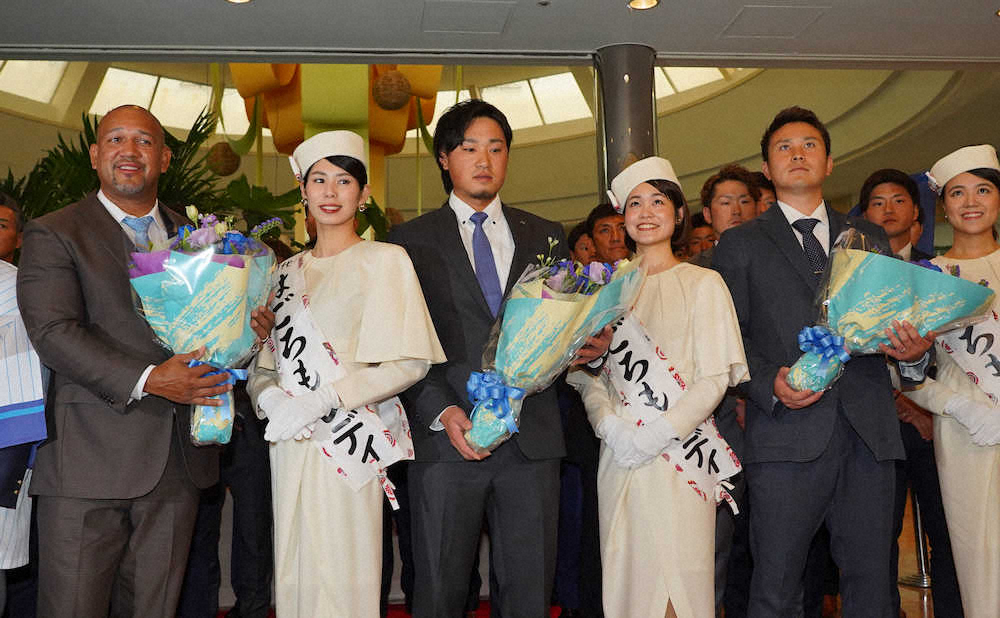 歓迎セレモニーで花束を贈られた(左から)ラミレス監督、石田、佐野(撮影・島崎忠彦)