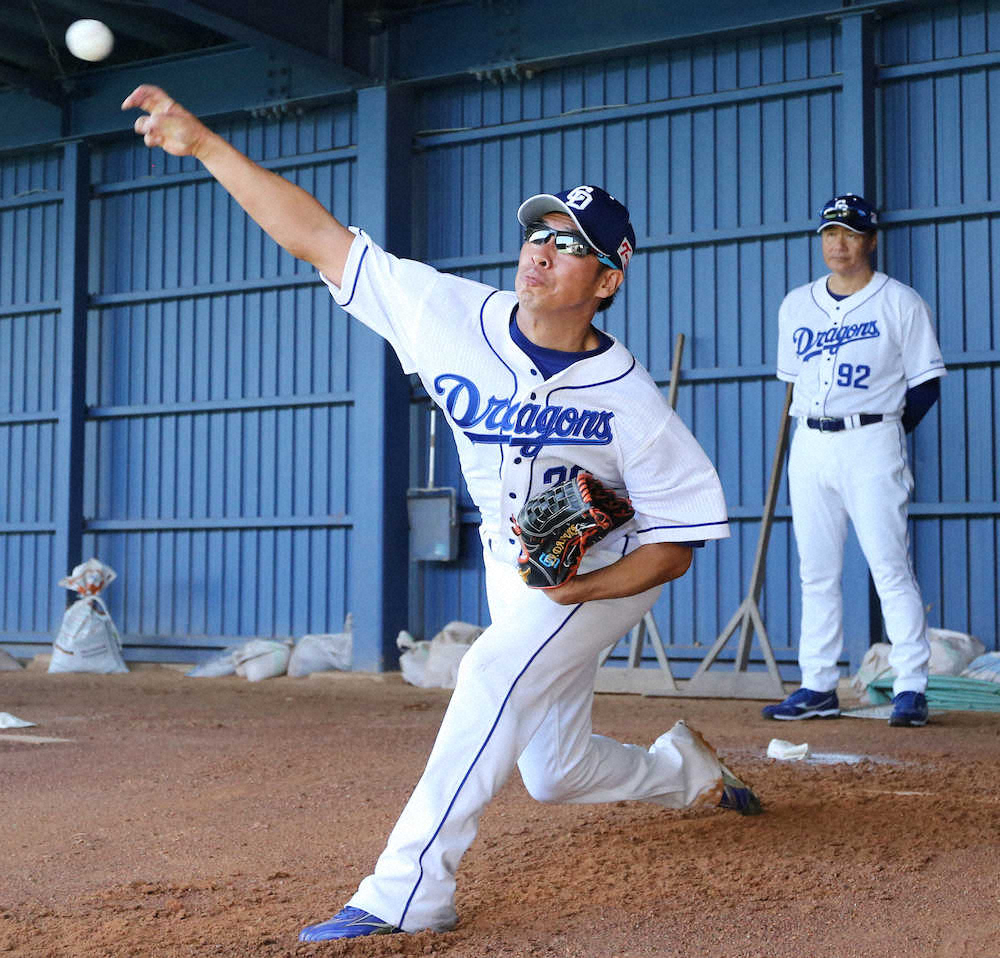 <中日キャンプ>ブルペンで投げ込む山井(右は与田監督)(撮影・椎名 航)