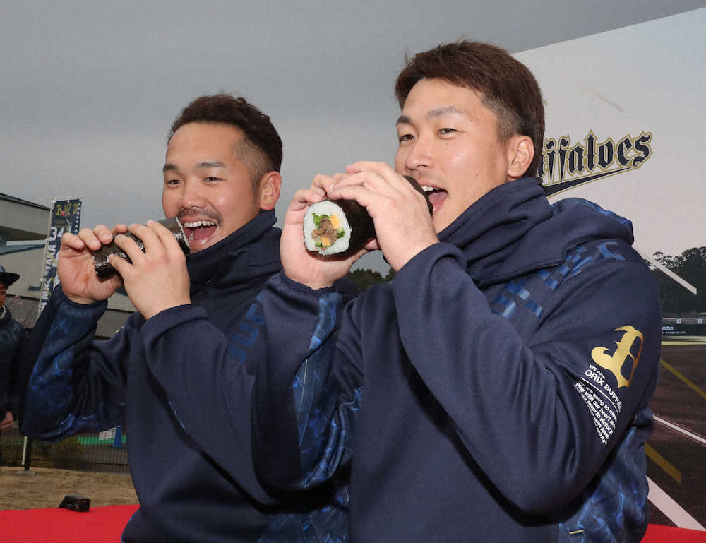 オリックス・T―岡田&安達が恵方巻きガブリ「1年間ケガなく活躍できるように」