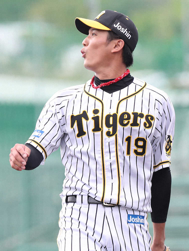 <阪神 春季キャンプ>シート打撃で高山に二塁打を打たれ、驚きの表情をみせる藤浪(撮影・平嶋 理子)