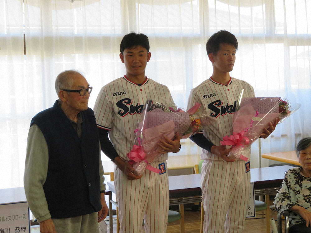 ヤクルトのドラフト1位・奥川は5日、キャンプ初の休日を迎え、2年目の市川と宮崎県西都市内の老人介護施設を慰問。質問コーナーでは「結婚はされてますか」と聞かれ「まだ18歳なのでしてません」と照れ笑いした。