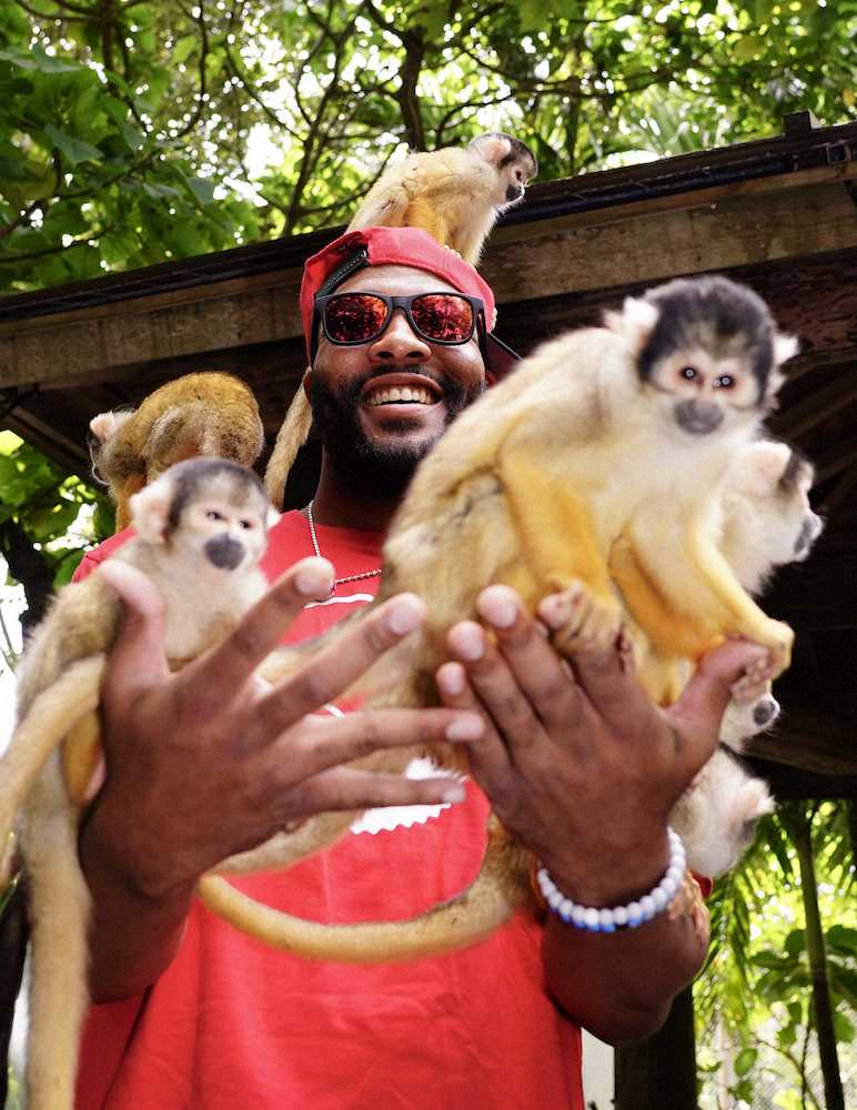 <ロッテ石垣島キャンプ>石垣やいま村を訪れリスザルにご満悦のジャクソン(撮影・長久保 豊)