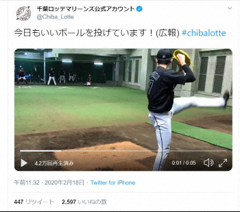 佐々木朗のブルペン投球を伝える千葉ロッテマリーンズ公式ツイッター(C)千葉ロッテマリーンズ Photo by 提供写真 ロッテ・朗希“幕張のクレメンスだ!”投球練習の動画3本公開、5時間で6万回… ギャラリーで見る この記事のフォト 2020年02月19日の画像一覧 もっと見る 2020年02月19日の画像をもっと見る