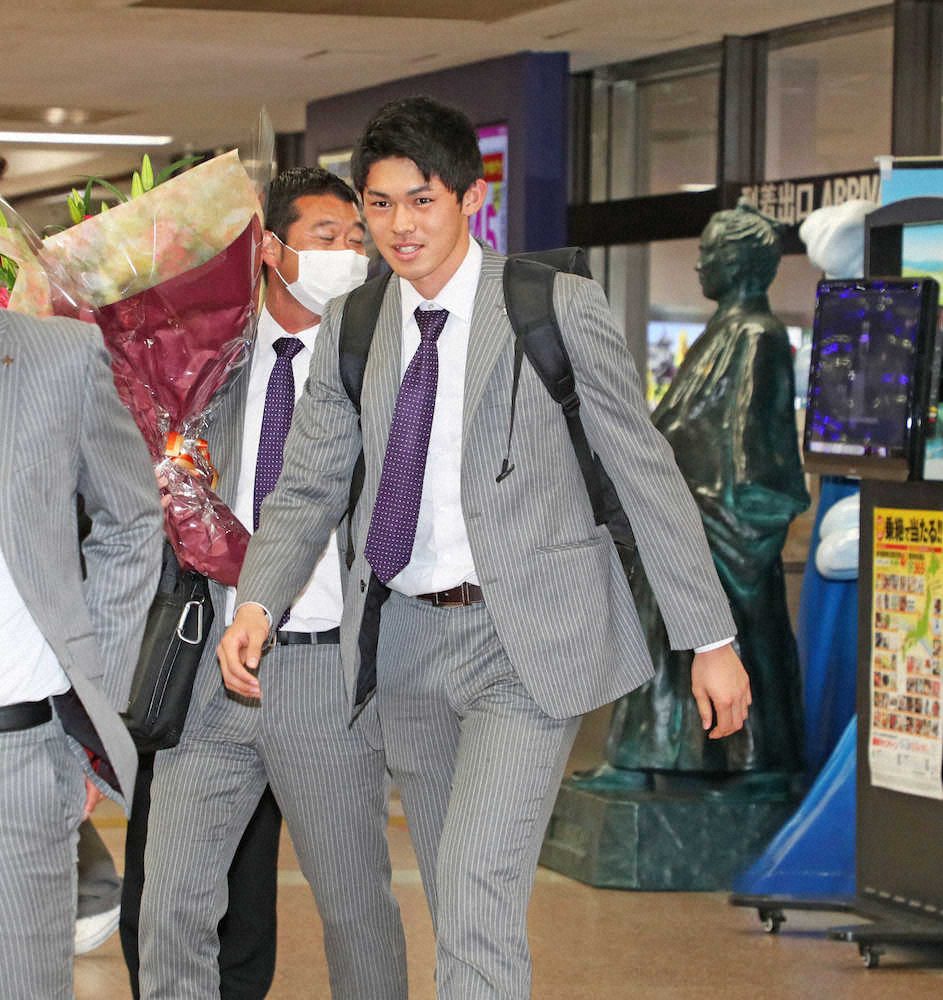 佐々木朗は坂本龍馬像(右奥)の出迎えを受けながら高知空港に到着した(撮影・西川祐介)