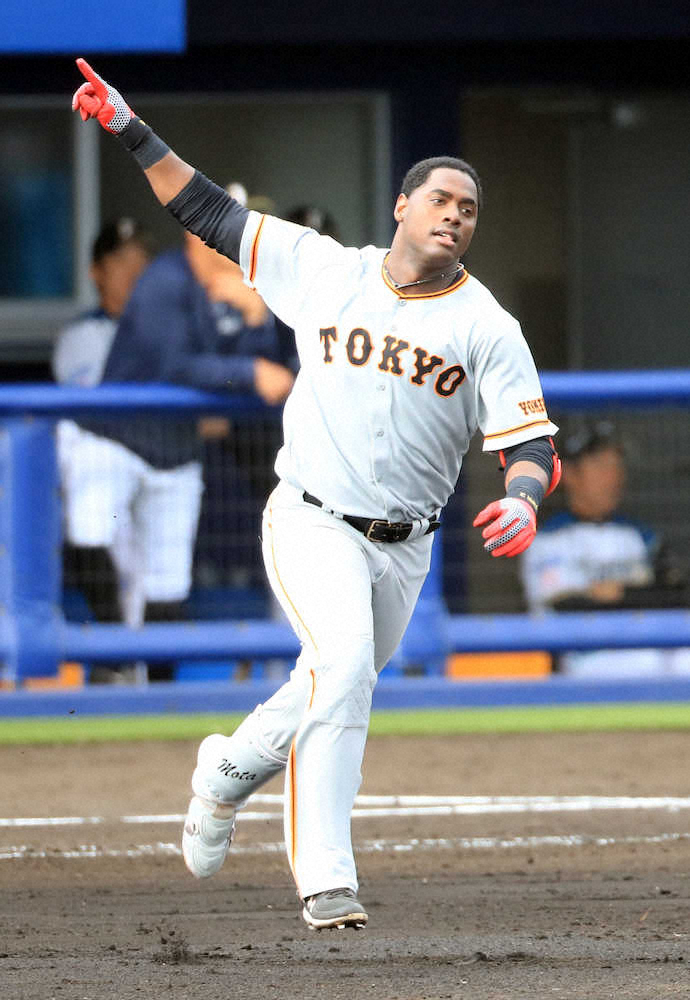 オープン戦<日・巨>8回無死、1号ソロを放ち一塁を回りNO・1ポーズのモタ(撮影・久冨木 修)