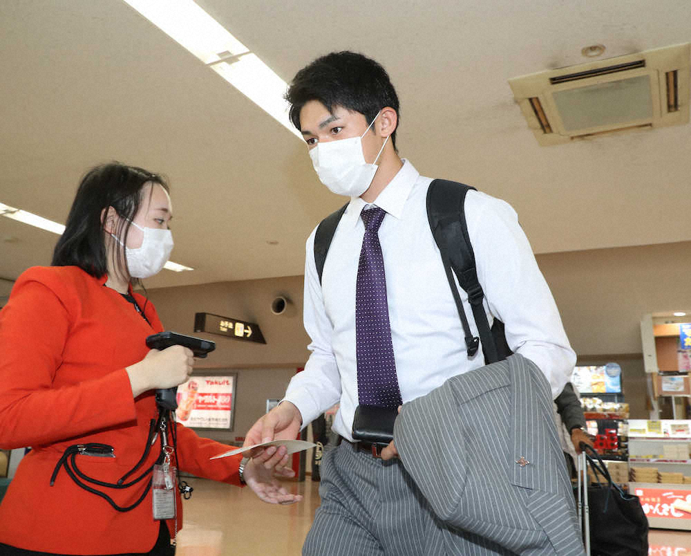 <ロッテ 宮崎移動>高知空港から宮崎行きのチャーター機に乗り込む佐々木朗 (撮影・西川 祐介)
