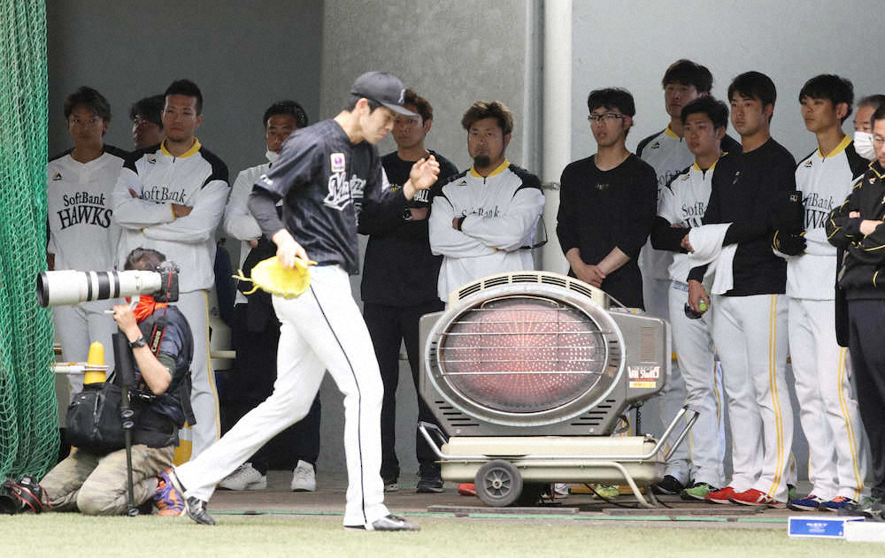 佐々木朗(手前)のブルペン投球を見学に訪れた(左から)東浜、千賀らソフトバンク投手陣