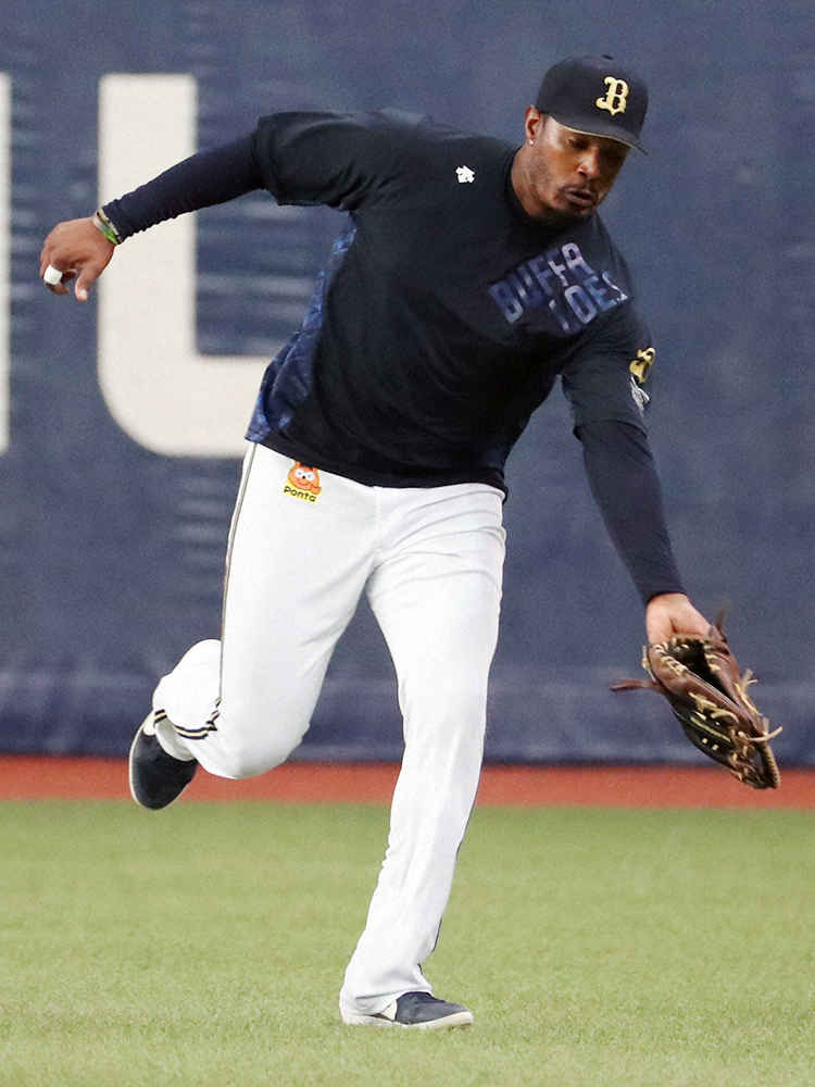 4日のロッテ戦、試合前に外野守備に入りボールを追うオリックス・ジョーンズ