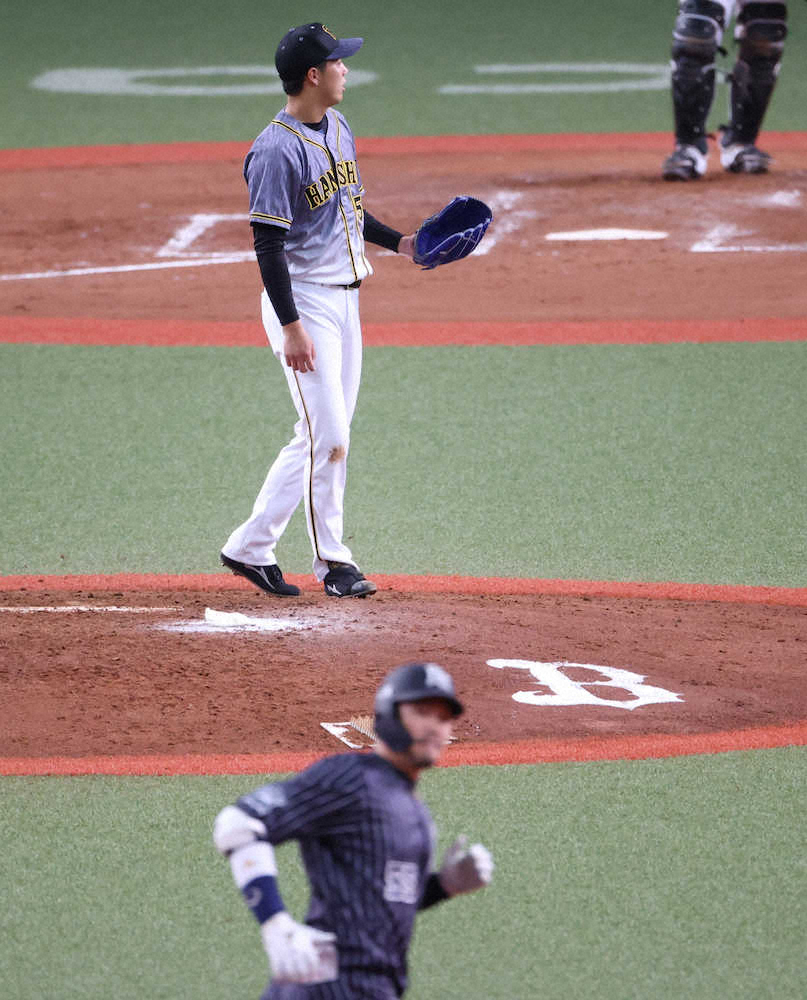 <オ・神>4回無死、T-岡田(手前)にソロ本塁打を浴びた青柳(撮影・北條 貴史)