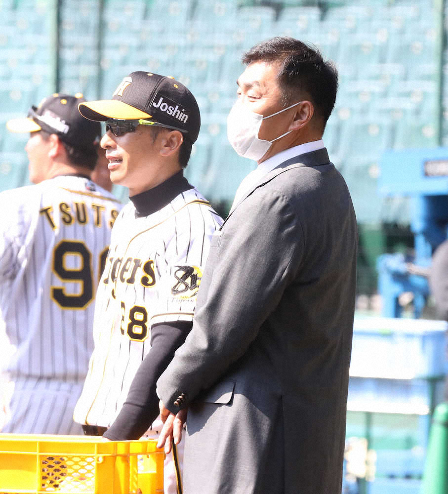 <阪神練習>甲子園球場を訪れ矢野監督(左)と話す山本昌氏(撮影・大森 寛明)