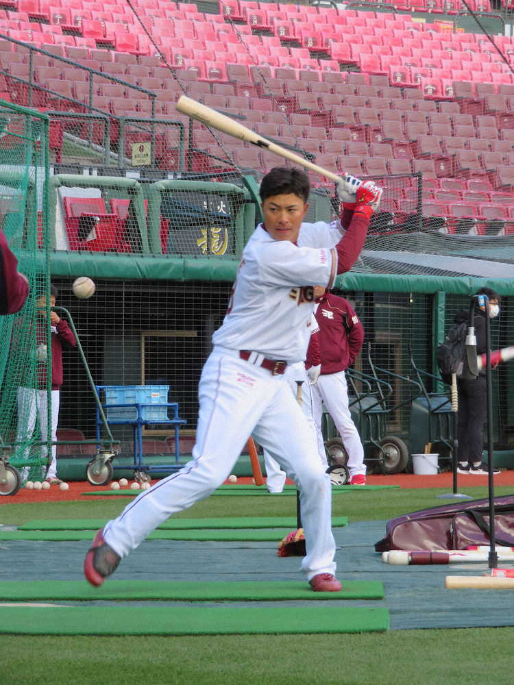 2軍では今季から就任した大村ファームディレクターとともに打撃フォームを大改造。ヤクルト・青木を参考にしたそうで「サブローさんが付きっきりで教えてくれた」と感謝する。ドラフト1位・小深田らルーキーの活躍が目立っているが「負けられない。開幕1軍を目指す」と話した。