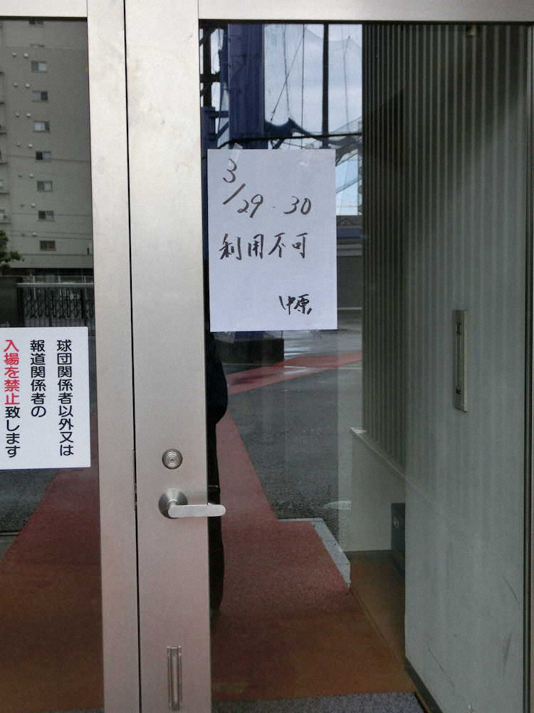 ≪中日 球場を清掃、消毒≫ナゴヤ球場はひっそりと静まり返っていた。中日は1、2軍とも完全休養日に加え、室内練習場には29、30日と「使用不可」の張り紙。30日には球場の清掃と消毒が行われるため、2軍の数選手が球場から室内に練習道具などを移動するために姿を見せただけだった。