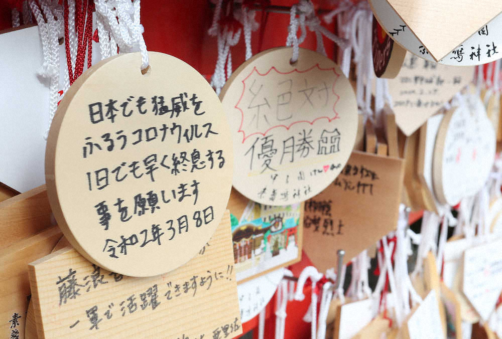 >新型コロナウイルス終息を願って書き込まれた、甲子園球場近くの素盞嗚神社の絵馬(撮影・坂田 高浩)