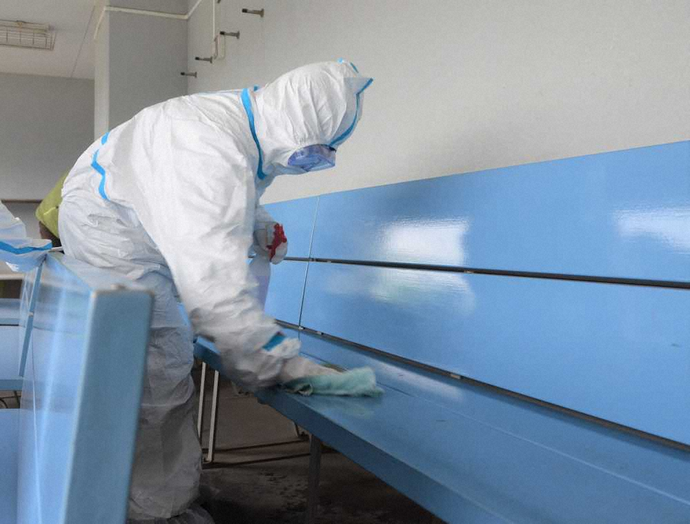 中日の2軍本拠地ナゴヤ球場で一塁側ベンチ内を消毒する作業員たち