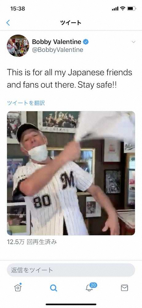 05年にロッテを日本一に導き、レンジャーズ、メッツ、レッドソックスでも指揮を執ったボビー・バレンタイン氏(69)が4日、自身のツイッターに日本のファンに向けた応援動画を投稿した。新型コロナウイルスの感染が世界中で拡大している中、マスク姿で「皆サーン、気ヲツケテクダサーイ!ガンバリマショー」と日本語でエールを送った。