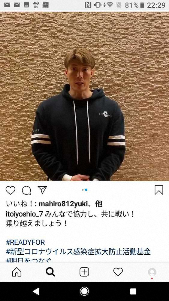 支援の輪を広げようと、ファンにも協力を求めた。すでにチーム内でも岩貞や浜地、俊介などが賛同して寄付。コメント欄上では各選手がそれぞれエールを送った。