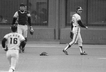 1982年4月3日、大洋戦。自らの暴投でサヨナラ負けとなり、立ち尽くす阪神・小林繁(中央)