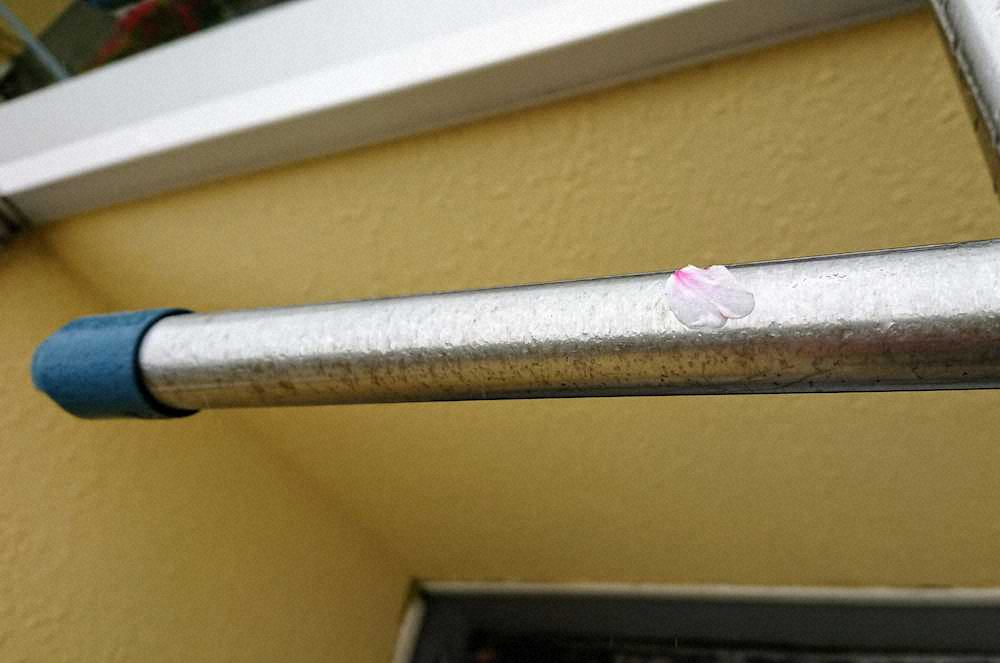ベランダの物干しざおに舞い降りた桜の花びらは美しかった