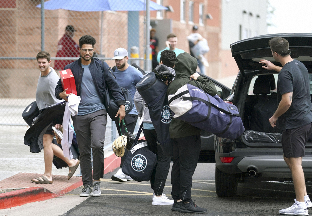 3月、オープン戦中止と開幕延期が決まり、キャンプ施設から荷物を運び出すマイナー選手ら