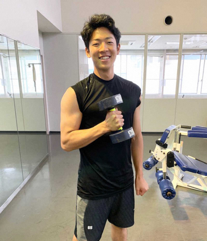 ダンベルを手に笑顔のロッテの古谷拓郎