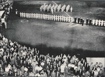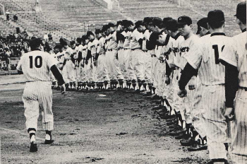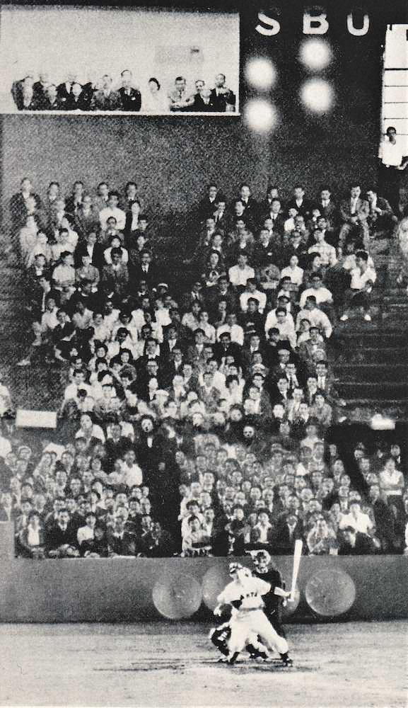 試合前、天皇・皇后両陛下にあいさつする両チーム選手と観客(1959年6月25日、後楽園球場)=阪神球団発行『タイガース30年史』より=