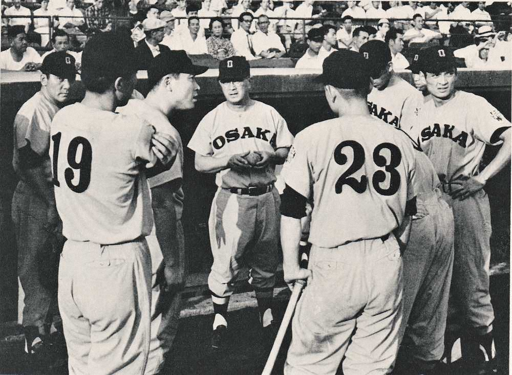 ベンチ前でのミーティング。(左から)藤村、大津、田中監督、吉田、辰市=阪神球団発行『タイガース30年史』より=