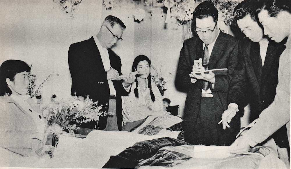 1958年、遠征地・広島で原爆患者を見舞った(左から)田中監督、梶岡コーチ、白坂主将、田宮=阪神球団発行『タイガース30年史』より=