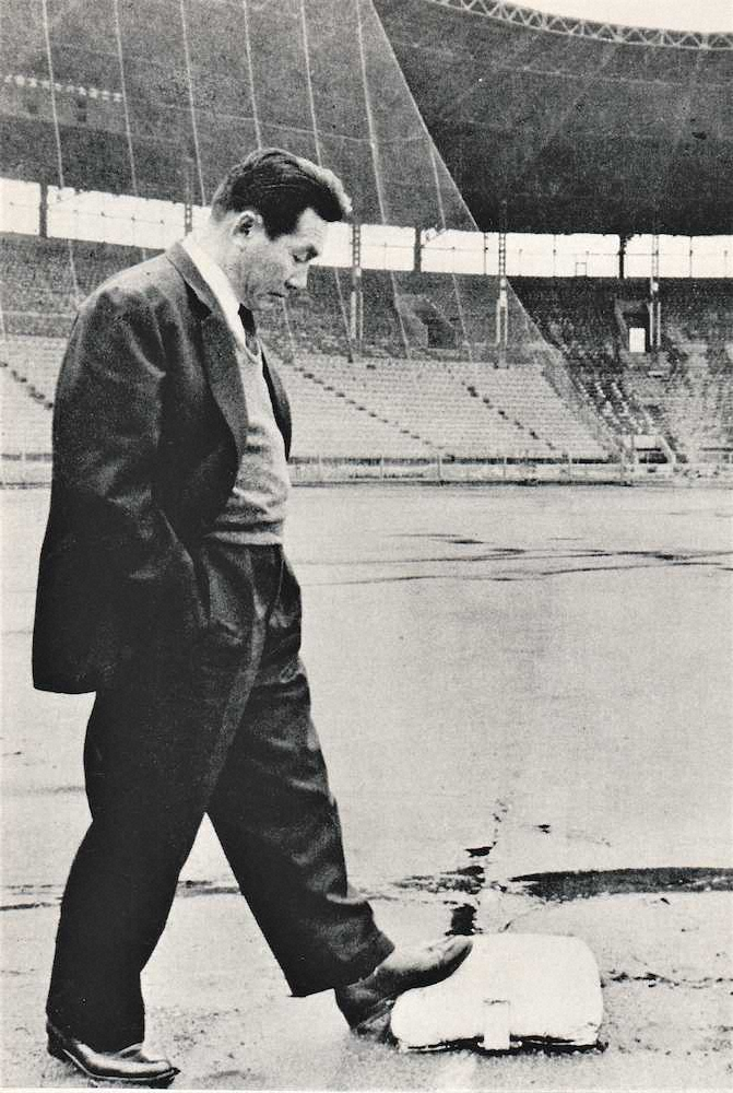 引退試合が雨天順延となり、背広姿でグラウンドに出た藤村富美男(1959年3月1日、甲子園球場)=阪神球団発行『タイガース30年史』より=