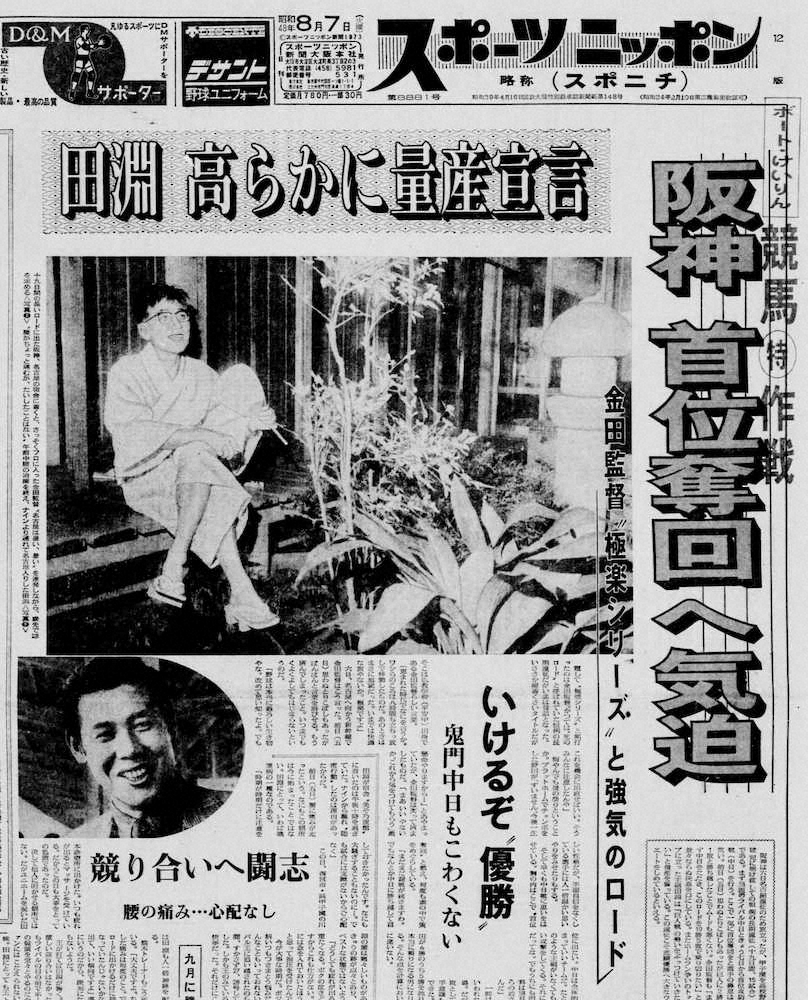 夏の長期ロード中の名古屋・美そ乃旅館で涼を求める金田監督(73年8月7日付スポニチ本紙1面)