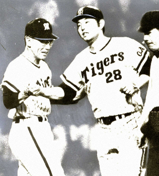 73年8月30日、中日戦の延長11回、自らサヨナラ弾を放ちノーヒットノーランを達成した江夏を出迎える金田監督