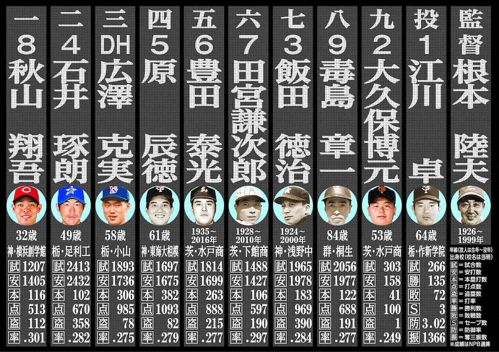 一塁に入る飯田徳治(浅野中)は南海、国鉄でプレー。勝負強い打撃と俊足で、55年にはMVP。南海の5度のリーグ優勝に貢献した名選手。西鉄黄金時代の遊撃手・豊田泰光(水戸商)は高卒1年目で27本塁打を記録。56年には首位打者を獲得し、日本シリーズで巨人を下し、MVPに輝いている。現役からは今年、レッズ入りした秋山翔吾(横浜創学館)がメンバーに加わった。