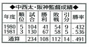 中西はシーズン終盤の10月12日、中日戦(ナゴヤ球場)終了後、名古屋市中区のレストランで「今季限りで退団する」と突然、辞意を表明した。前日11日夜、球団社長・小津正次郎が兵庫・川西市の上田利治(スポニチ本紙評論家)の自宅に電話し監督就任を要請。後に阪急監督に復帰する上田は辞退したが、情報が中西に伝わっていた。さらに3年前、招へいに失敗した前ヤクルト監督の広岡達朗(評論家)にも食指を動かしていた。