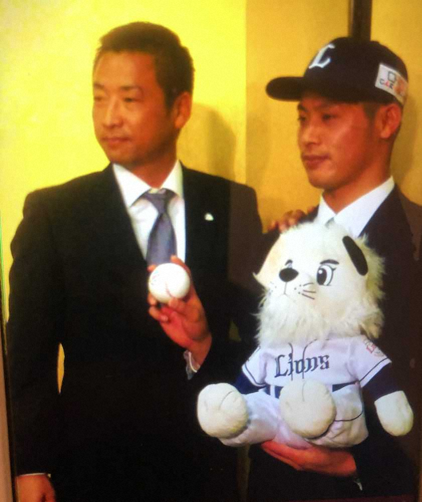記念撮影する西武・鈴木スカウト(左)と岸(球団提供)