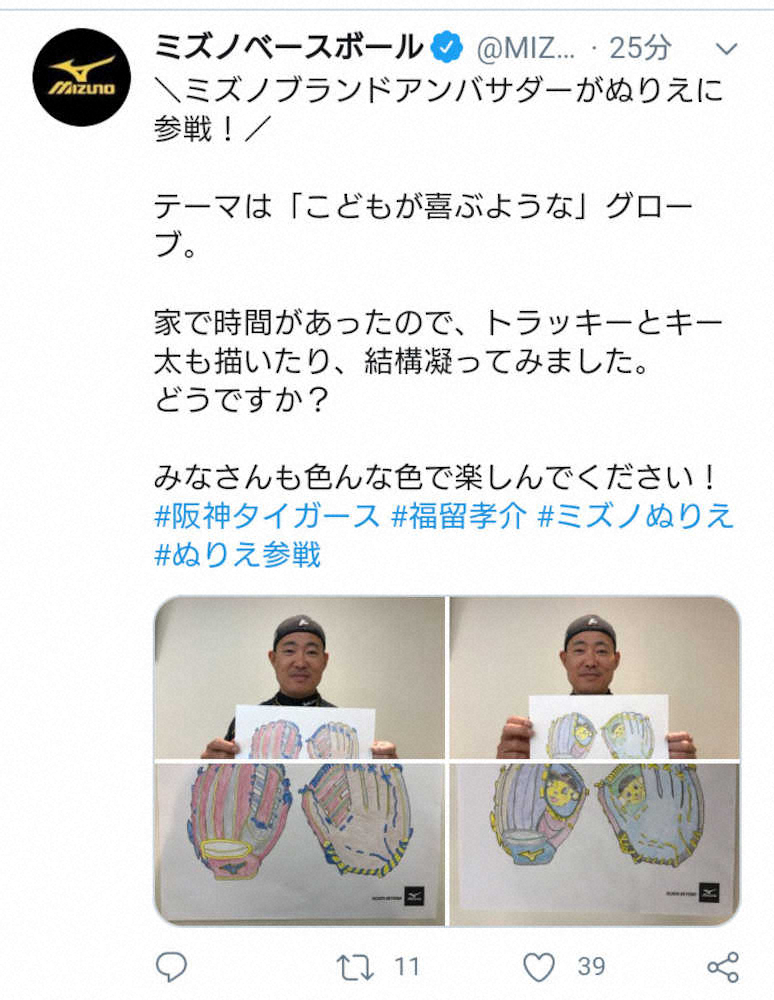福留はミズノベースボールの公式Twitter上で「こどもが喜ぶような」というテーマの元、グローブの塗り絵に参加。「家で時間があったので、トラッキーとキー太も描いたり、結構凝ってみました。どうですか?みなさんもいろんな色で楽しんでください!」と“オリジナルグラブ”を描いた様子を披露した。 (コメントは全てミズノベースボール公式Twitterから引用)