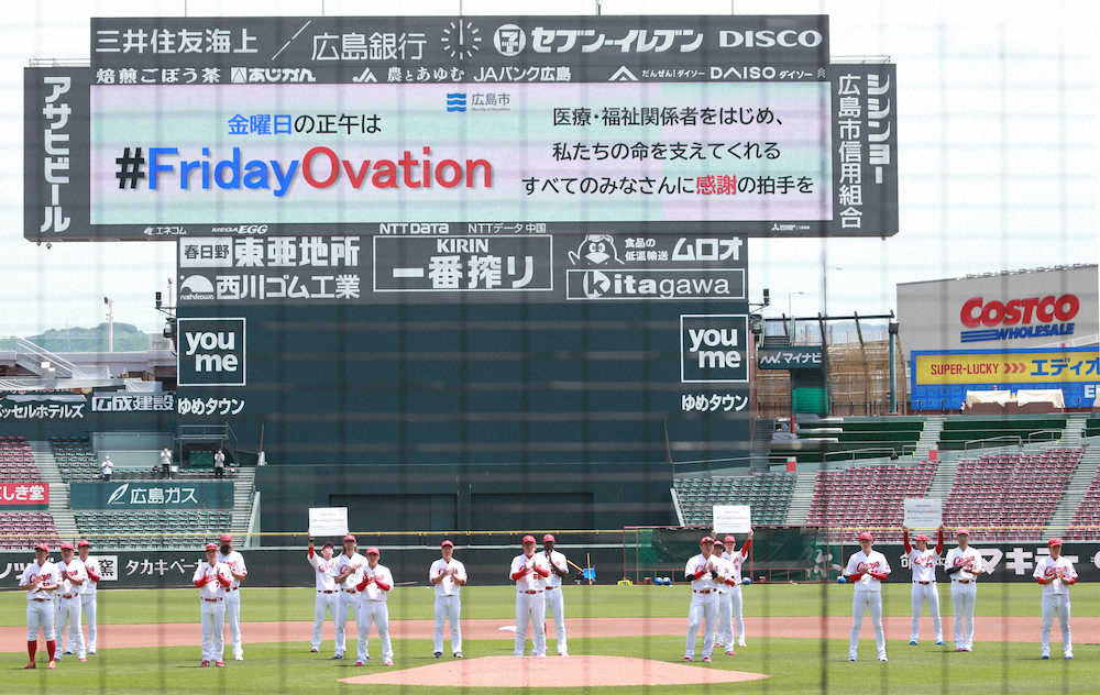 広島は新型コロナウイルス感染拡大に対応する医療従事者らに感謝を示すため、正午に合わせてナインが約1分間、拍手をした。